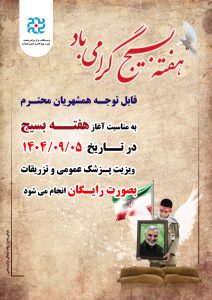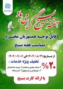 قابل توجه همشهریان گرامی، به مناسبت هفته بسیج از روز پنجشنبه مورخ ۱۴۰۴/۰۸/۲۹ لغایت پنجشنبه مورخ ۱۴۰۴/۰۹/۰۶، 20% تخفیف ویژه خدمات: